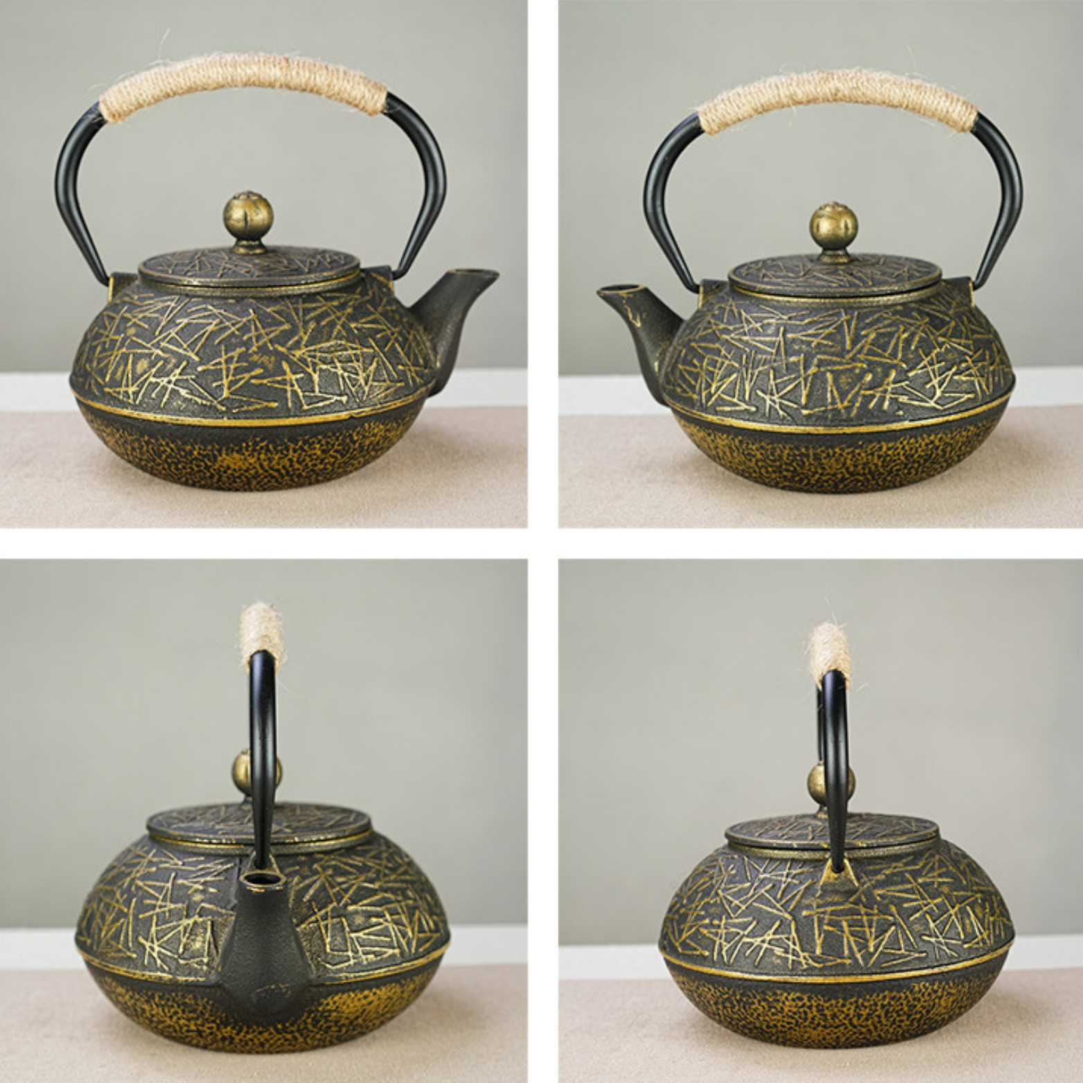 La théière en fonte japonaise Kinmura séduit par son design raffiné et ses motifs dorés inspirés de la nature. Forgée dans la tradition nipponne, elle allie robustesse et élégance, tout en maintenant la chaleur du thé plus longtemps grâce à sa fonte de qualité supérieure. Sa poignée recouverte de corde offre une prise en main confortable et authentique, rappelant l’artisanat japonais.